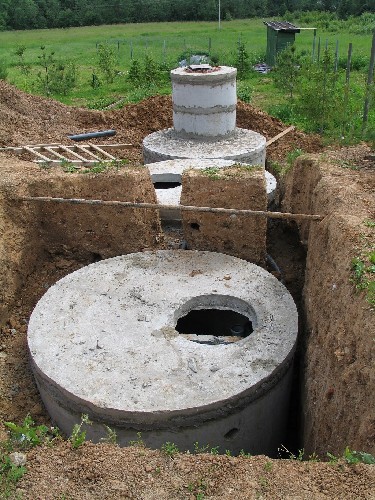 Септик. У цьому випадку каналізація побудована за так званим ґрунтовому принципом очищення стічних вод. Суть її полягає в тому, що спочатку стічні води з каналізаційного стояка надходять в підземний трубопровід, потім в септик (колодязь) об'ємом не менше 2,5 м3, розрахований на видалення з нього опадів два рази в рік, в якому фекальні води висвітлюються і через дренажну мережу йдуть у грунт. Септик повинен мати обсяг не менше трикратного припливу стічних вод на добу, що забезпечує тривалість їх відстоювання на протязі 3 діб та накопичення осаду, що випадає, на протязі року. Септик продуктивністю 1 м3/добу повинен мати приблизний розмір: діаметр 1,5 м і глибину 2,5 м. Септик розташовують на відстані від 5 до 20 м від п. Дренажі повинні бути нижче місць водозабору питної води за течією